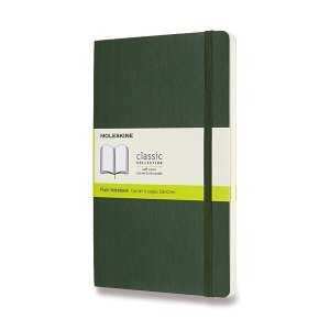 Zápisník s měkkou, ve hřbetu šitou vazbou v kartonových deskách, obepnutý pružnou páskou proti samovolnému otevírání.