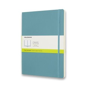 Zápisník s měkkou, ve hřbetu šitou vazbou v kartonových deskách, obepnutý pružnou páskou proti samovolnému otevírání.