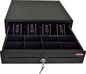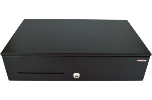 Velká černá pokladní zásuvka POS-420 (bez zdroje) s automatickým vysouváním pro pohodlnou a rychlou manipulaci s bankovkami a mincemi má robusní, tvrdou kovovou konstrukci.