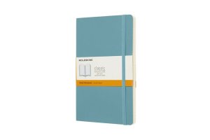 Zápisník s měkkou, ve hřbetu šitou vazbou v kartonových deskách, obepnutý pružnou páskou proti samovolnému otevírání.