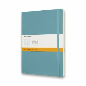 Zápisník s měkkou, ve hřbetu šitou vazbou v kartonových deskách, obepnutý pružnou páskou proti samovolnému otevírání.