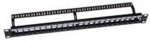 Modulární patch panel Lexi-Net má 24 pozic pro keystone kategorie 5e a 6a s vyvazovací hrazdičkou 1U 19".