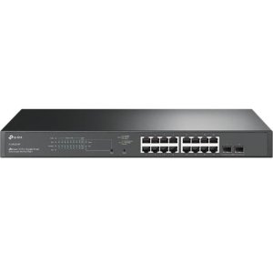 Switch, 16 PoE+ portů, 2 gigabitové sloty SFP pro vysokorychlostní připojení, celkový výkon PoE portů 150 W, duální zásobník IPv4/IPv6, platforma Omada SDN, aplikace Omada, barva černá.