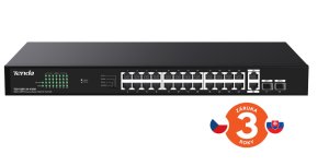 Tenda TEG1128P-24-410W je 26ti portový Gigabitový Ethernet PoE switch s napájením PoE af/at a 2x SFP sloty. 24 portů 10/100/1000 Mb/s je napájeno pomocí PoE 802.3af/PoE 802.3at (celkem 370 W) + 2x RJ45 …