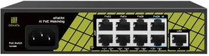 Ethernetový PoE switch, 9x LAN port (z toho 1 uplink port), rychlost 10/100 Mbps, napájení přes AC konektor, bez ventilátoru – tichý chod, kovový kryt, napájení až 8 zařízení.
