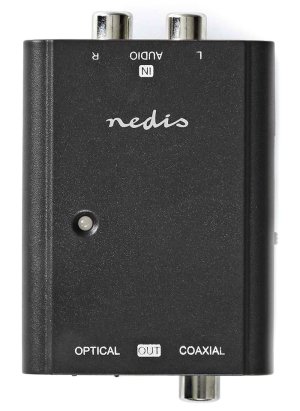Nedis ACON2508BK; Tento digitální audio převodník převádí analogový stereofonní zvukový signál na digitální Toslink nebo RCA zvukový signál na vstupním portu přijímače nebo zesilovače.