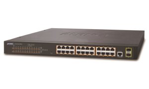 PLANET GS-4210-24P2S; Spravovatelný PoE přepínač 24 portů 1000Base-T s injektory 802.3at, výkon až 300 W, 2x SFP porty 100/1000Base-X.