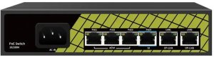 Ethernetový PoE switch, 6x LAN port (z toho 2 uplink porty), rychlost 10/100 Mbps, napájení přes AC konektor, bez ventilátoru – tichý chod, kovový kryt, napájení až 4 zařízení.