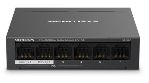 PoE+ Switch Mercusys MS106LP 6Port 100 MbpsPoE Switch 6× 10/100 Mbps RJ45 portů se 4 porty PoE+ Podpora výkonu PoE až 30 W pro každý port PoE (max. 40 W) 2× Uplink porty při zapnutí režimu izolace.