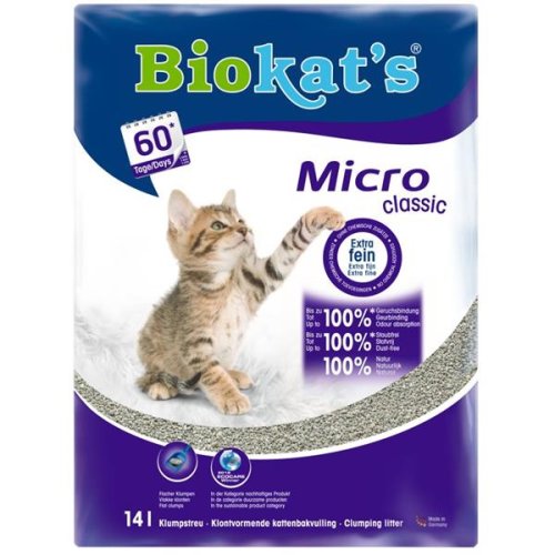 extra jemný granulát z přírodního jílu s německou kvalitou bezprašná a pohlcující zápach tento kočkolit má 4 x vyšší užitnost, než jiné běžné kočkolity 1 litr Biokat´s Micro váže minimálně 3 litry tekutiny zajistí snadnou údržbu kočičí toalety vydrží až 45 dní skvělý poměr cena/výkon