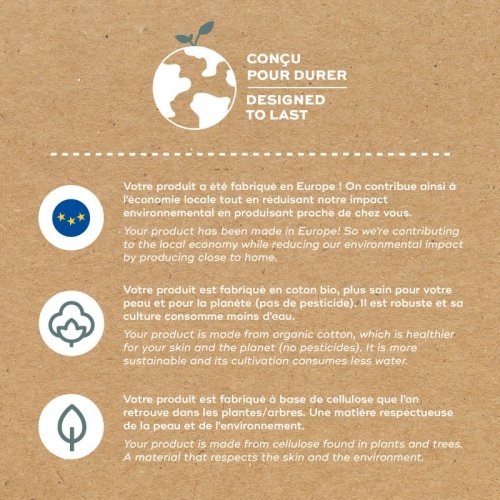 • materiál: vrchní strana 100% organická bavlna / spodní část: 95% organická bavlna + 5% elastan / střední část: 70% lyocell® + 30% biobavlna / uvnitř: polyuretan