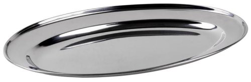 Oválný nerezový tác délky 35 cm. Vhodný na servírování, je tenký a lehký, přesto pevný, skladný a snadno omyvatelný. EAN 8584163020195