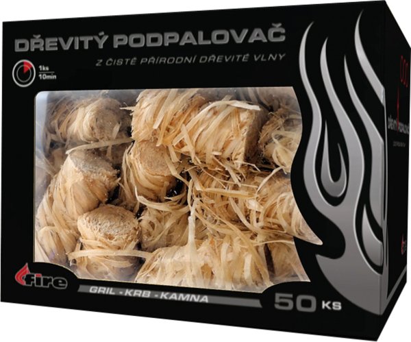 Fire dřevitý podpalovač 50 ks x 58 mm - tento podpalovač na bázi dřevěných hoblin má vynikající podpalovací schopnosti a je vhodný k podpálení různých druhů materiálů, bez potřeby papíru nebo třísek. Jeho síla je především v době hoření, kdy jeden smotek hoří až 10 minut. Během této doby mu neodolá téměř žádný materiál, který by nepodpálil. Baleny jsou jednotlivé smotky do krabičky po 50 ks a zabaleny smršťovací fólií. Je vhodný pro zatápění v krbech, kamnech, zahradních grilech, ale i otevřených ohništích.
