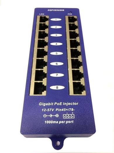 Panel integrující osm gigabitových pasivních POE injektorů s