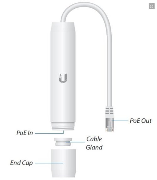 Venkovní PoE extraktor pro napájení většiny RouterBOARDů nebo zařízení od Ubiquiti s gigabitovým portem. Jedná se o převodník z aktivního napájení označeného jako 802.3af na pasivní PoE 24V/0,5A s maximální zátěží 12W.