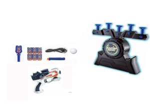 Sada obsahuje terč (výška 30 cm), 2 pistole, šipky a míček. Lze nabíjet přes USB kabel či pomocí baterií – baterie nejsou součástí balení.