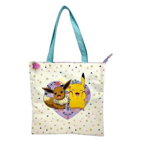 Prostorná látková taška s květinovým designem a motivy Pokémonů.