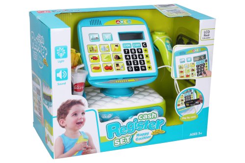 Pokladna. Velikost 22,5x15x22 cm. Obsahuje pokladnu, košík s potravinami, peníze a kreditní kartu. Pokladna funguje jako kalkulačka. Má vysunovací šuplík na peníze. Světlené a zvukové efekty. 2xAA baterie nejsou součástí.