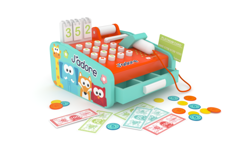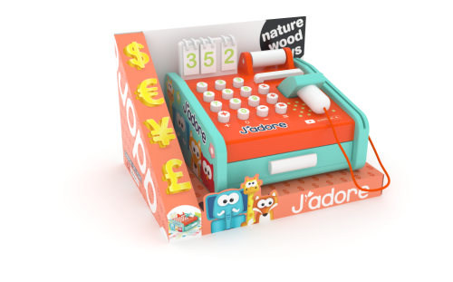 Pokladna je vyrobena z kvalitního, přírodního dřeva s hladkými hranami a veselým designem, který zaujme malé i větší obchodníky.
