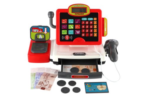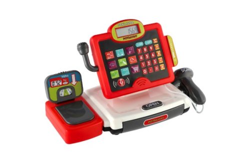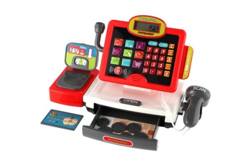 Dětská elektronická pokladna s doplňky pro každý správný obchod! Součástí je čtečka se světlem a zvukem, makety bankovek a mincí, slot pro kreditní kartu, funkční kalkulačka i váha na ovoce a zeleninu. Na baterie, nejsou součástí balení. Rozměr balení: 36 x 21 x 17 cm Vhodné pro děti od 3 let