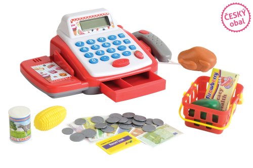 Pokladna set. Balení obsahuje pokladnu, košík s potravinami, kreditku, bankovky, mince. Velikost pokladny 25 cm. Vytváří světelné a zvukové efekty. 2xAA nejsou součástí, krytka zespodu pokladny.