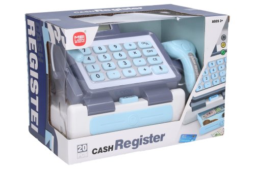 Pokladna s efekty modrá. Velikost 25x15x18,5 cm. Funkce kalkulačky, mikrofon, otevírací šuplík na peníze. Baterie 3xAA nejsou součástí.