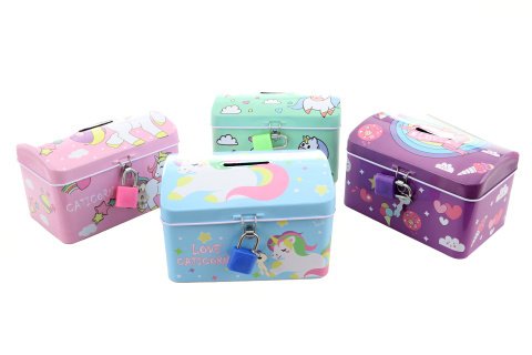Kovová pokladnička na zámeček s motivem jednorožců. V balení 2 klíčky. Rozměry 13x8x8 cm. Baleno v sáčku. Věk 3+