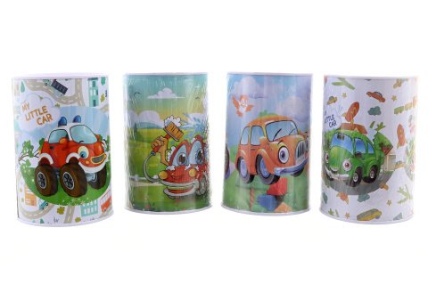 Kovová pokladnička s motivem veselých autíček. Rozměr pokladničky cca 13x9 cm. 4 druhy - dodáváme dle skladové dostupnosti. Věk 3+