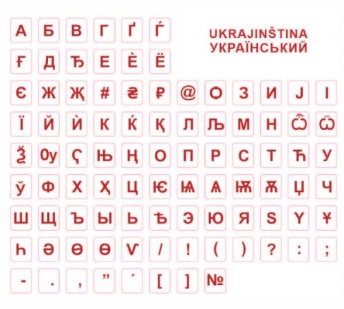 *Červená barva písma a průhledné pozadí přelepů *Přelepka vhodná na nalepení na světlou klávesnici s černým písmem *Azbuka s kompletní sadou znaků používanou na Ukrajině *Jednotlivé přelepky velikost 6 x 7 mm *Kompletní aršík má velikost 10 x 9 cm *Přelepky je možné lepit i na kraj kláves *Kompletní přetisky, vhodné i pro notebooky
