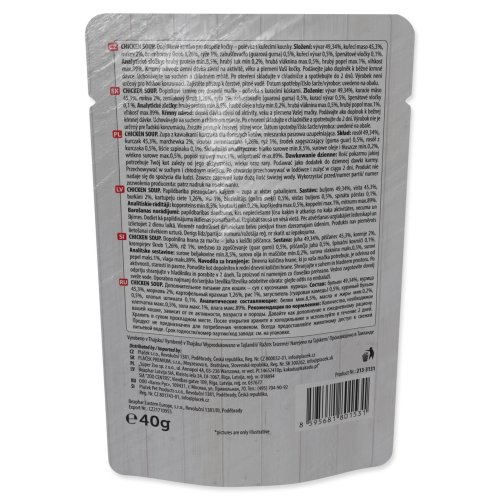 Složení: vývar 49,34%, kuřecí maso 45,3%, mrkev 2%, bramborový škrob 1,26%, rýže 1%, zahušťovadlo (guarová guma) 0,5%, kuřecí vývar 0,5%, špenátové vločky 0,1%.