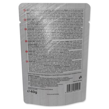 Doplňkové krmivo pro dospělé kočky – polévka s kousky kuřete a zeleninou, kterou můžete dopřát samostatně nebo jako doplněk k suchému krmivu.