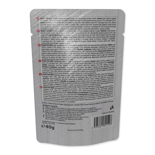 Vývar 50,82%, makrela 31,2%, tuňák 15%, bramborový škrob 1,24%, červeno hnědá rýže 1%, zahušťovadlo (guarová guma) 0,37%, rybí vývar 0,37%.