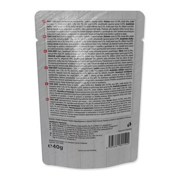 Vývar 54,79%, tuňák 40%, sladké brambory 2%, bramborový škrob 1,3%, rýže 1%, rybí vývar 0,52%, zahušťovadlo (guarová guma) 0,39%.