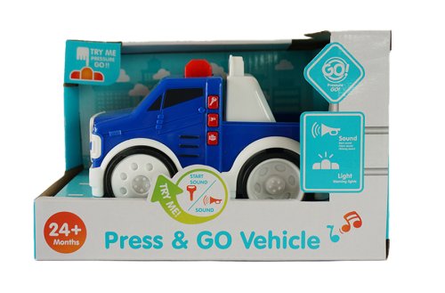 Plastové auto, velikost 15 cm. 3 zvuky, startování, houukání a zvuk motoru. Při stalečení majáku auto jede a maják svítí.