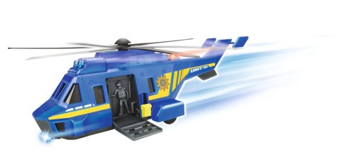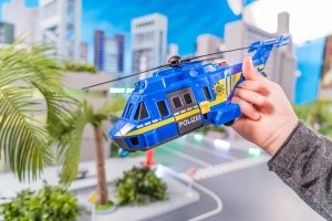 Policejní helikoptéra na volnoběh, se světelnými a zvukovými efekty a otevíracím bočním panelem. Vezmi helikoptéru do ruky a leť! Speciální funkce - pohybové číslo spouští zvuk letící helikoptéry. Velikost 26 cm, měřítko 1:24.