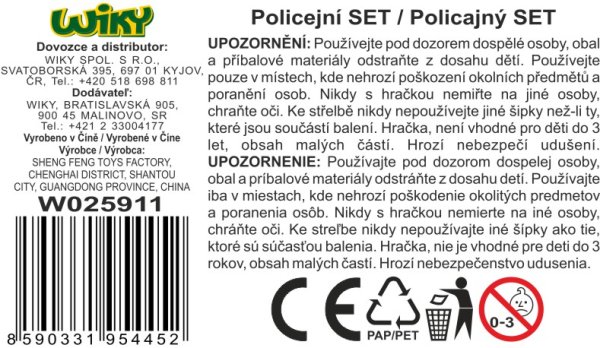 Policejní set. Obsahuje pistoli, 3 náboje, pouzdro na náboje, obušek, pouta, sluchátka s mikrofonem.