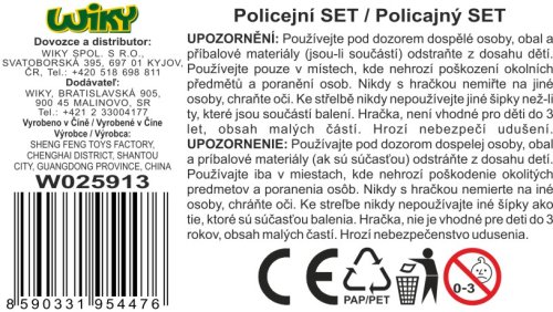 Policejní set. Velikost pistole 20,5 cm. Obsahuje pistoli, 3 náboje, odznak, pouta.