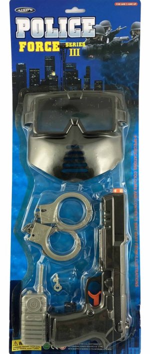 Sada pro malého policistu. Obsahuje samopal, vysílačku, masku a další doplňky. Materiál: plast. Rozměr samopalu cca 25 x 12 cm