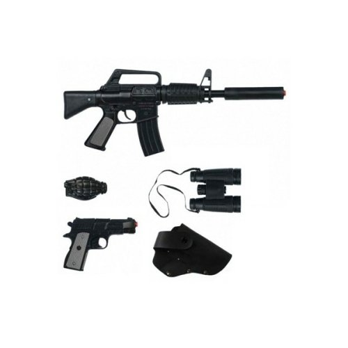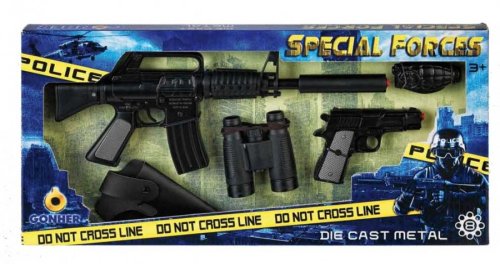 Policejní sada Speciální jednotky obsahuje kovou policejní pistoli, tlumič, dalekohled, policejní odznak, pouzdro na pistoli a policejní samopal. Vše je vyrobeno z kovu. Vše je na kapslíky – osm ran. Vyrobeno ve Španělsku. Věk: 4+
