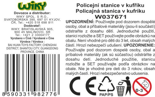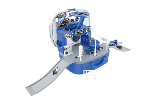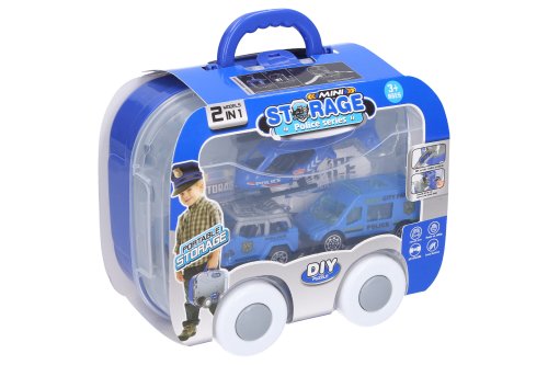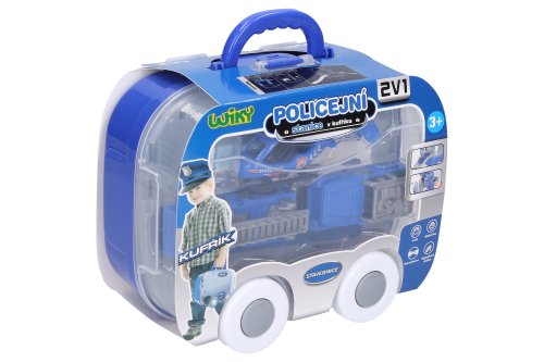 Policejní stanice v kufříku. Rozměry 44x17x19 cm, velikost auta 6 cm. Součástí 2 auta, 1 vrtulník. Manuální výtah.