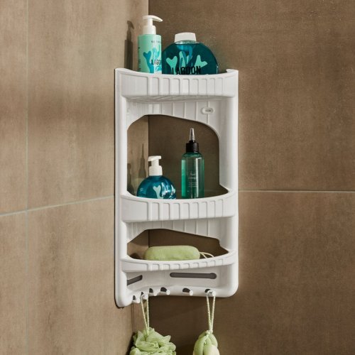 Třípatrová rohová plastová police s háčky na zavěšení, určena k montáži na stěnu. Rozměry 20 x 20 x 60 cm (Š x H x V). EAN 8696287091668