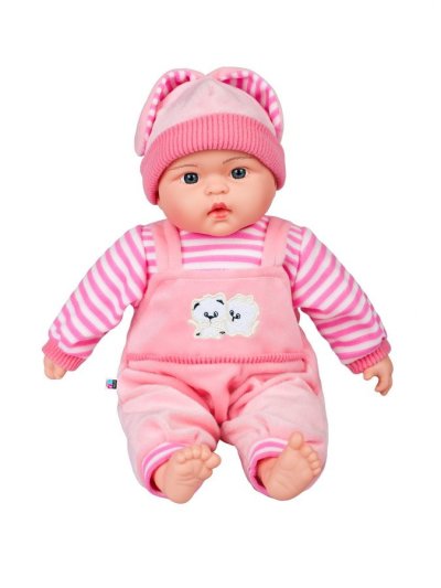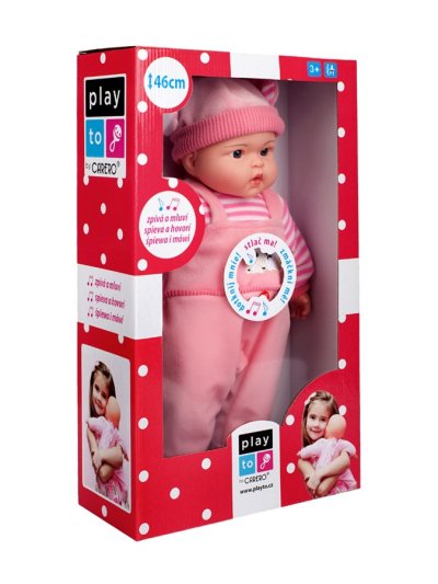 Dětská panenka PlayTo. Skvělá hračka pro každou holčičku. Hlava, ruce a nohy jsou vyrobeny z gumy, tělíčko pak z měkkého materiálu, díky čemuž se může dítě k panence krásně přitulit. Panenka má celou sadu oblečení, včetně botiček a čepičky. Oblečení lze sundat a vyprat. Panenka má krásnou, usměvavou tvář, barevné oči a řasy jako u živého miminka. Délka panenky 46 cm. Panenka má polský modul a mluví tyto polské věty: mamusiu, tatusiu, tatusiu weź mnie na rączki, mamusiu kocham cię a jiné. Panenka zpívá tyto polské písničky: Jadą jadą misie, Kosi kosi łapci, Miała baba koguta, Ta Dorotka, My jesteśmy krasnoludki.