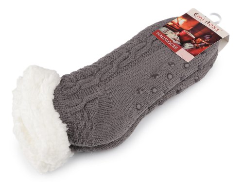 [Krátké teplé ponožky vás skvěle zahřejí.] Jsou heboučké, z vrchní strany pletené, uvnitř je teplá chlupatá podšívka, která věrně imituje vlnu. Protiskluzové gumové plošky na chodidle zabrání uklouznutí, můžete je používat i jako domácí obuv. Široký měkký lem je příjemný na nošení.
