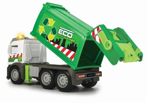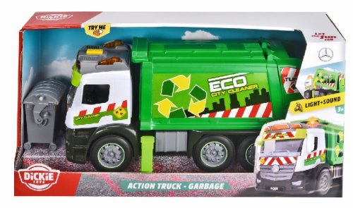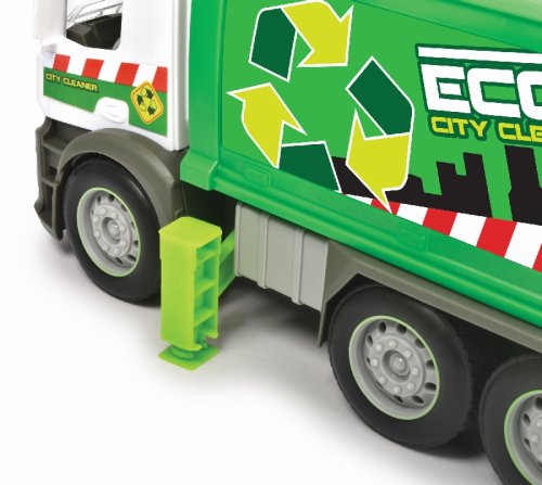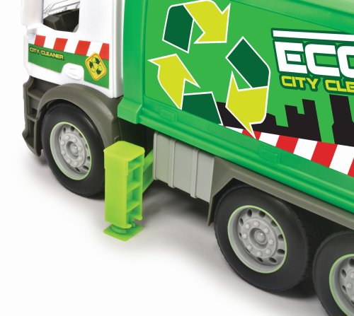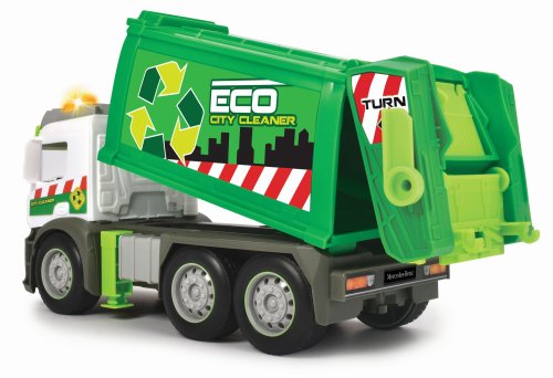 Popelářské auto Mercedes na setrvačník se světelnými a zvukovými efekty a pohyblivými díly, s kontejnerem. Sklápění korby a otevírací zadní panel. Délka 26 cm.