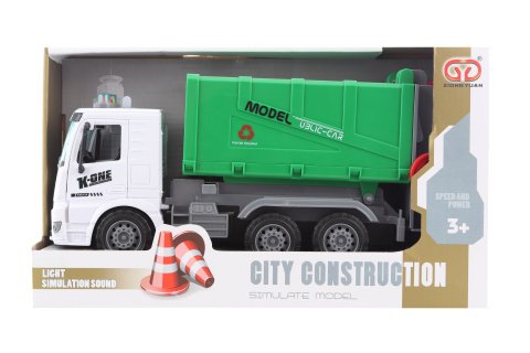 Plastové popelářské auto na baterie. Pomocí dvou tlačítek umístěných na kabině vydává zvuky jízdy a couvání.Obsahuje 2 popelnice,pomocí kolečka lze popelnice vysypávat. Baterie 3xAG13 jsou součástí balení. Manuálně lze otevírat zadní část nádoby na odpad. Baleno v krabici. Rozměry balení cca 32x11,5x18x5 cm. Rozměry auta cca 28x14x8,5 cm. Věk 3+
