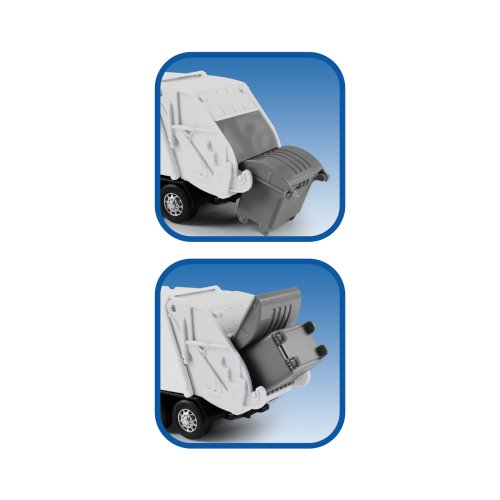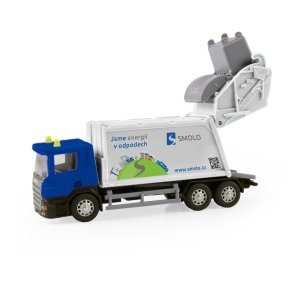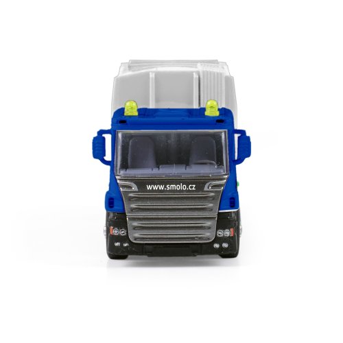 Kovové popelářské auto s plastovou korbou a logem SMOLO. Korba má v zadní části odklápěcí dveře, součástí je otevírací popelnice. Auto jezdí na zpětný chod a jeho délka je 15 cm.