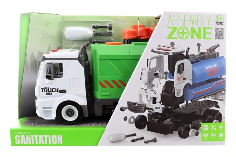 Krásné velké šroubovací popelářské auto. Napájení na 3 AG13 baterie, které jsou součástí balení. Auto má na střeše 4 tlačítka s fukncemi-startování, troubení,pípání při couvání a houkání. Také svítí světlo na střeše. Auto je šroubovací, šroubovák je součástí balení. Materiál plast. Auto je na setrvačník. Baleno v otevřené krabici. Rozměry balení cca 36x22x13 cm. Rozměry auta 33x13x11 cm. Věk 3+