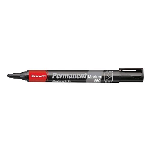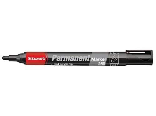 Permanentní popisovač LUXOR 250 černý s kulatým hrotem lze použít na většinu povrchů.