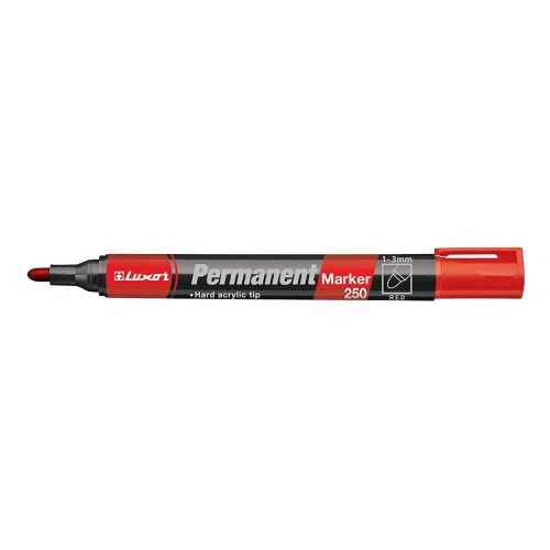 Permanentní popisovač LUXOR 250 červený s kulatým hrotem lze použít na většinu povrchů.