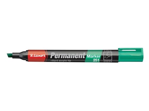 Permanentní popisovač LUXOR 251 zelený se seřízlým hrotem lze použít na většinu povrchů.